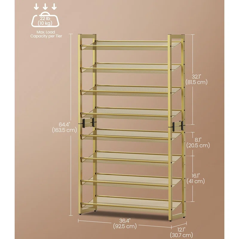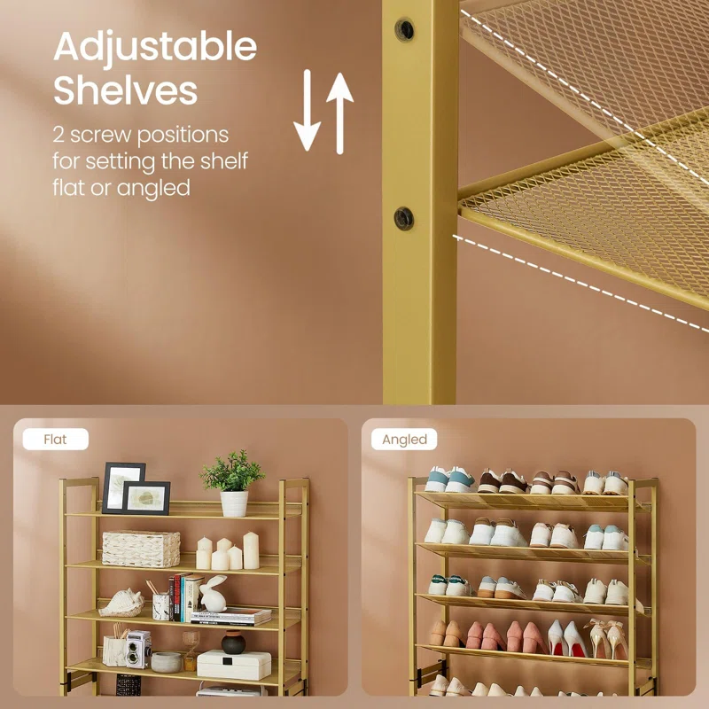 Assemble the shelves flat or angled for easy access. You can also split the 8-tier rack into two separate 4-tier units to fit different rooms or stack them for a complete 8-tier organizer.